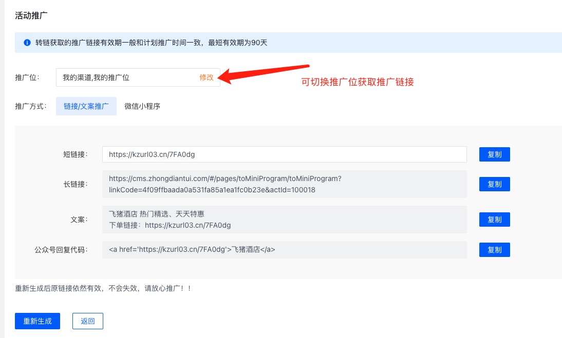 点击【立即推广】系统会创建一个默认的推广位来生成推广链接,推广链接根据不同的推广活动可能会支持不同的推广场景:例如飞猪支持 H5链接,和微信小程序