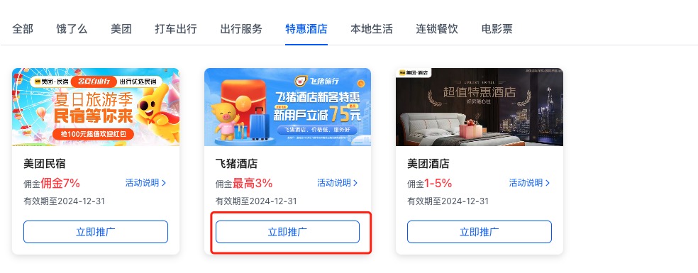 在页面的右侧,您将能够浏览到多个联盟合作项目,包括但不限于美团联盟、饿了么、打车出行服务、酒店预订、本地生活服务以及电影票购买等。
