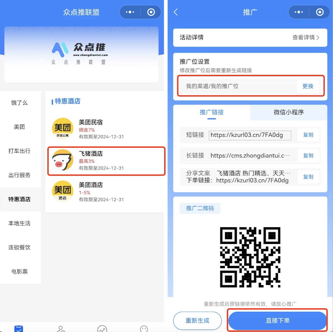 我们以飞猪酒店为例进行说明,打开小程序首页 点击左侧【特惠酒店】-> 【飞猪酒店】系统会根据默认的推广位来生成推广链接,推广链接根据不同的推广活动可能会支持不同的推广场景:例如飞猪支持 H5链接,和微信小程序